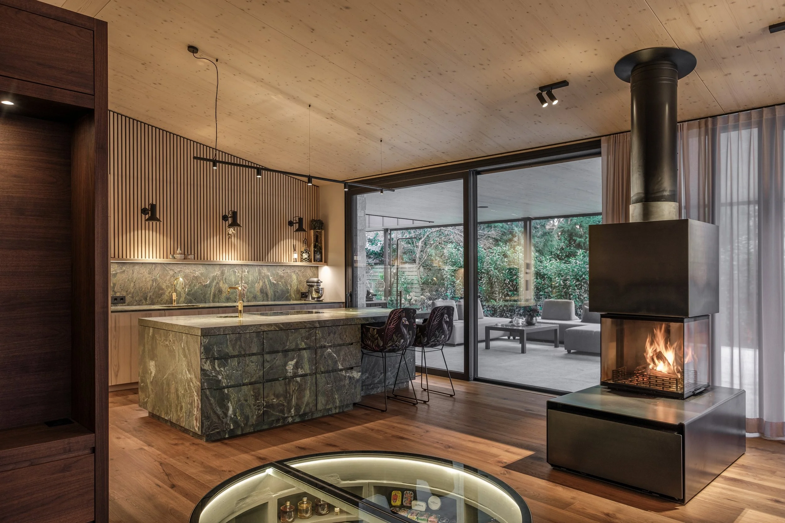 In dem in Holzbauweise errichteten Haus prägen natürliche Materialien und Farben das Wohngefühl. In der Küche trifft eine markante Steininsel auf dunkel geöltes Nussholz und weiß geölte Kernesche. Marineblau und Grüntöne in Stoffen und Polstern schaffen Ruhe und Geborgenheit, während das Beleuchtungskonzept „Move it“ von XAL das Gestaltungskonzept stimmig ergänzt.