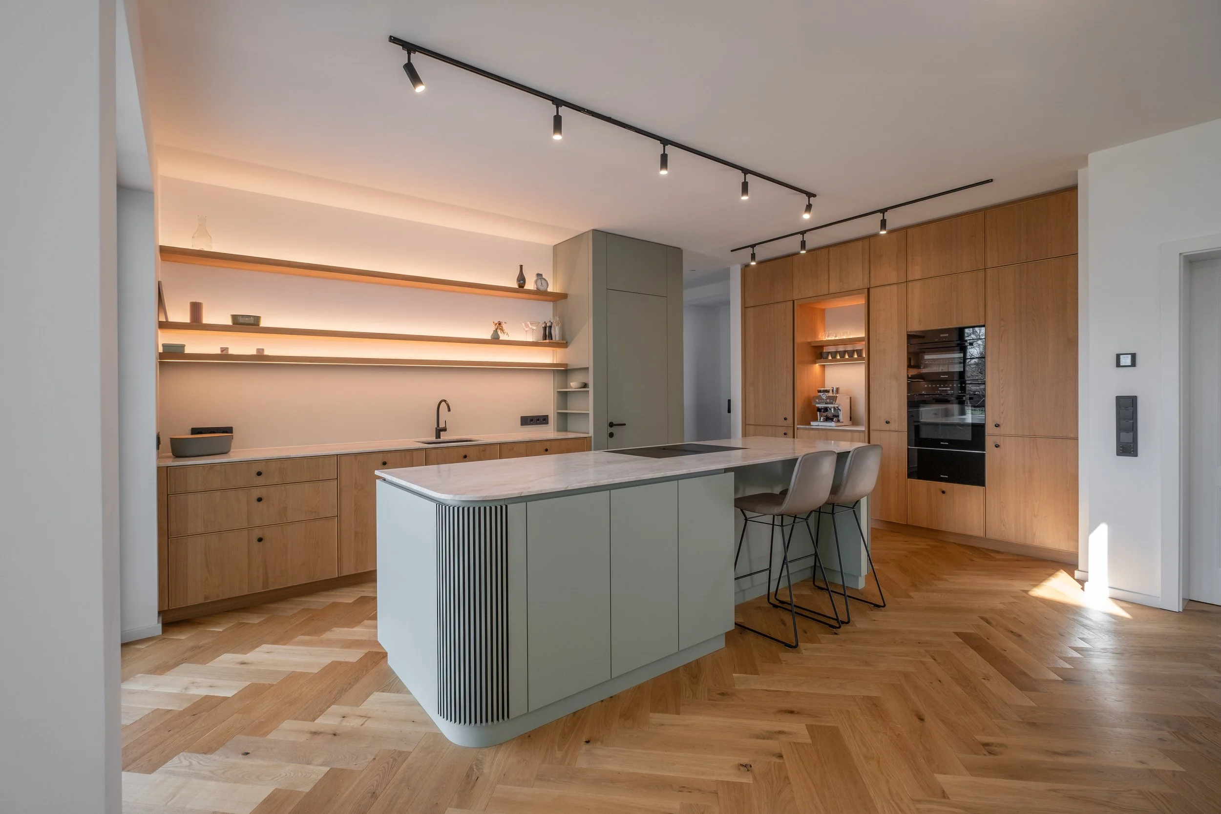 Eine moderne Küchenarchitektur, die durch klare Linien und eine ruhige Materialpalette überzeugt. Im Mittelpunkt steht eine, nach besonderen Wünschen angefertigte Kochinsel in mattem Salbeigrün, kombiniert mit einer hellen, fein strukturierten Arbeitsplatte. Warme Eiche prägt die fix verbauten Möbel und setzt einen natürlichen Kontrast zu den glatten, lackierten Fronten. Offene Sideboards schaffen Leichtigkeit und inszenieren ausgewählte Objekte.